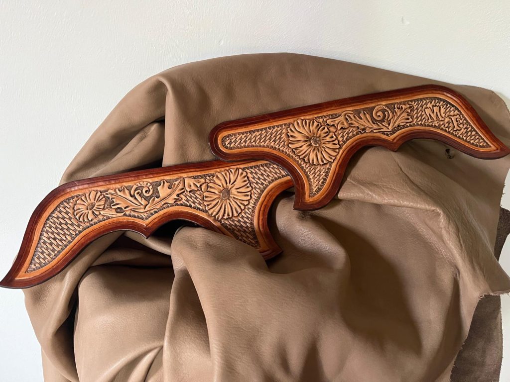 D’une part, le motif secondaire structure et équilibre la création. Il peut se décliner en frise, en paysage stylisé ou en décoration discrète sur les bords de la pièce. D’autre part, le motif principal attire le regard : véritable point focal, il transforme le cuir en support artistique. Grâce au tannage végétal, nous repoussons ou gravons le cuir avec une grande liberté, allant jusqu’à des rendus très réalistes.